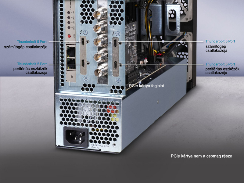 Következő újdonságunk az Echo SE I T5 Thunderbolt 3, 4 és 5 csatlakozáson keresztül is használható, ráadásul a Windows mellett macOS és Linux oprendszereken is. 8-szoros PCIe 4.0 sebességet tud Thunderbolt 5 mellett, de nem GPU-kártyákhoz készült. A támogatott PCIe-kártyák listájában professzionális hangkártyákat, ethernet-adaptereket, Firewire, SAS/SATA vezérlőket, M.2 SSD-modulos kártyákat és videódigitalizálókat találunk.